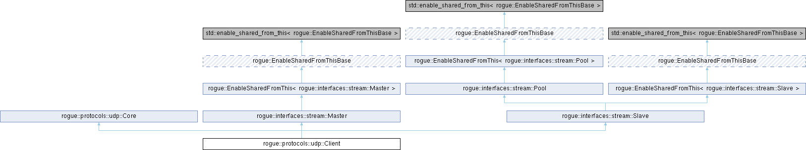 Client combines UDP transport (udp::Core) with Rogue stream interfaces: